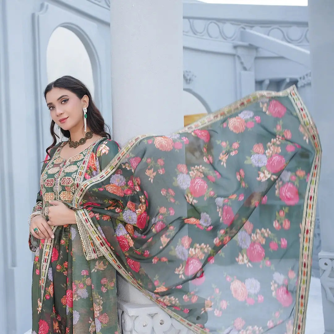 Handcrafted Wool 3-piece set with intricate embroidery and a printed dupatta for timeless elegance. Perfect for formal occasions or refined everyday style.