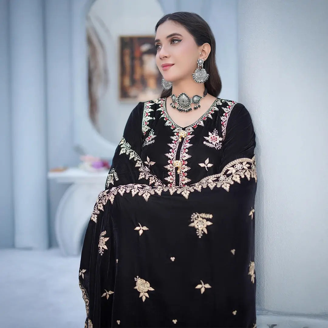 Elevate your wardrobe with this exquisite velvet 3-piece ensemble, crafted from premium micro fabric featuring 11000 thread count for unparalleled softness and durability. The coordinated shawl completes the sophisticated look, while intricate handmade embroidery adds timeless elegance and artisanal craftsmanship. Perfect for formal occasions and celebrations, this collection combines luxurious comfort with refined style, showcasing meticulous attention to detail in every stitch.