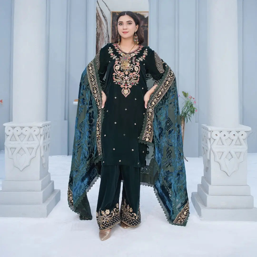 Elevate your wardrobe with this exquisite velvet 3-piece ensemble, crafted from premium micro fabric featuring 11000 thread count for unparalleled softness and durability. The coordinated shawl showcases intricate handmade embroidery, adding sophisticated artisanal detail to your collection. Perfect for formal occasions and celebrations, this luxurious set combines traditional craftsmanship with refined elegance, ensuring you make a distinguished impression.