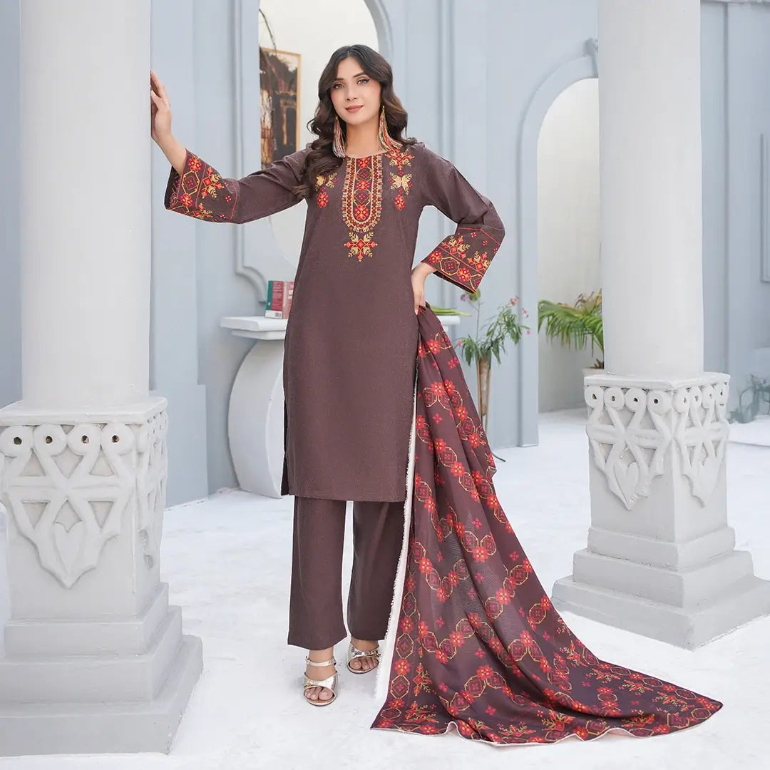 Crafted from premium wool, this sophisticated 3-piece ensemble combines traditional artistry with contemporary elegance. The intricately embroidered components showcase meticulous needlework, while the printed dupatta adds a striking visual dimension to complete your look. Ideal for formal occasions and festive gatherings, this set delivers refined style with authentic craftsmanship. The wool fabric ensures comfort and durability, making it a versatile addition to your wardrobe that transcends seasonal boundaries.